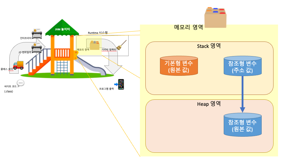 - 참조형 변수 : 원본 값이 Heap 영역에 있다.