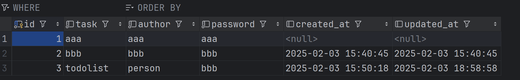 처음에 내가 작성한 리포지토리 클래스에서 일정을 저장하는 함수이다. 디비가 알아서 current timestamp로 저장을 해주겠지 하고 task, author, password만 인서트했다.