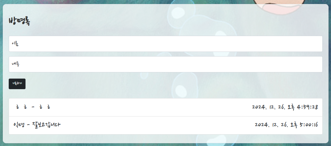그리고 강의에서 배운 내용 이외에 추가적을 구현한 내용이 있다. 방명록 기능을 구현할 때 이 방명록을 남긴 시간도 같이 남기고 싶어서 시간을 표시하는 기능도 구현했다.