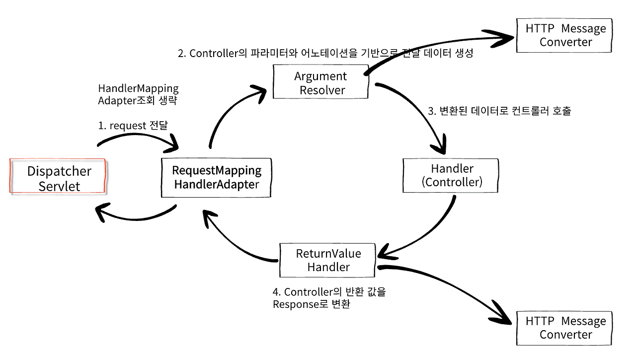RequestMappingHandlerAdapter는 ArgumentResolver를 호출하여 Controller가 필요한 다양한 파라미터의 값을 생성한다. 마찬가지로 반환할 때는 ReturnValue Handler를 이용한다. 이때 HttpMessageConverter를 이용한다. ArgumentResolver를 통하여 값이 준비되면 해당값을 가지고 실제 Controller를 호출한다.